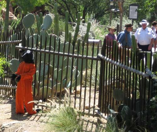 Families visiting Disneyland on their holiday this week saw a life-size Guantanamo bay inmate standing inside the Rocky Mountain Railroad ride at Disneyland in Anaheim California. The sculpture, consisting of an inflatable doll dressed in an orange jumpsuit with its hands and feet manacled remained in place for one and a half hours before Disneyland's security staff shut down the ride and removed it amid fears over public safety.[Wooster Collective]