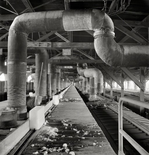 March 1943. “Topeka, Kansas. Wheeling an engine in the Atchison, Topeka & Santa Fe locomotive shops.” Photo by Jack Delano. [via Shorpy.]